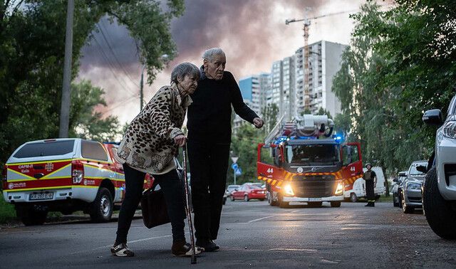 4일(현지시각) 러시아가 우크라이나 키이우에 드론과 미사일 공세를 가하면서, 아파트 뒤로 연기가 피어오르는 가운데 노부부가 길을 건너고 있다. UPI연합뉴스 |