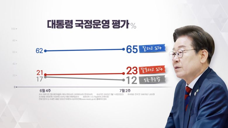 이재명 대통령의 국정 지지율이 65%를 기록했다는 여론조사 결과가 나왔습니다.