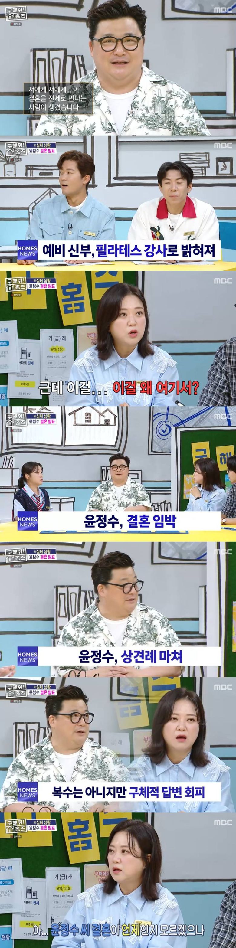 10일 방송된 MBC 예능 프로그램 '구해줘! 홈즈'에서는 윤정수가 예비신부에 대해 소개하며 결혼 소식을 알린 장면이 전파를 탔다.