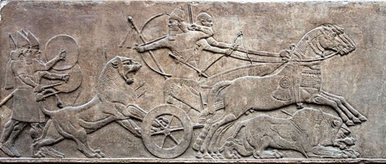이 작품은 이런 전통을 더욱 다듬어진 형태로 선보인 대표적인 유물이다. 기원전 7세기쯤 이라크 북부에 있는 님루드 궁전 벽에 부착한 작품인데, 아시리아 제국의 전성기를 이룬 아슈르나시르팔 왕의 사자 사냥 장면을 담았다. 달리는 전차 위에서 뒤돌아보며 활을 쏘는 왕의 강인한 모습을 중앙에 두고, 한편에는 사자 몰이를 하는 병사들의 진지한 모습도 새겨 넣었다. 바닥에서 고통스럽게 죽어가는 사자도 생생하고 실감 나게 표현됐다. 화살을 맞고도 전차를 따라가며 포효하는 사자의 동작에서는 역동성이 느껴진다. 겁에 질려 두려움에 떨면서 날뛰는 말들, 말들을 진정시키며 전차를 끄는 병사의 침착한 모습까지 모두 합쳐져 사자 사냥의 현장감을 더하고 있다.