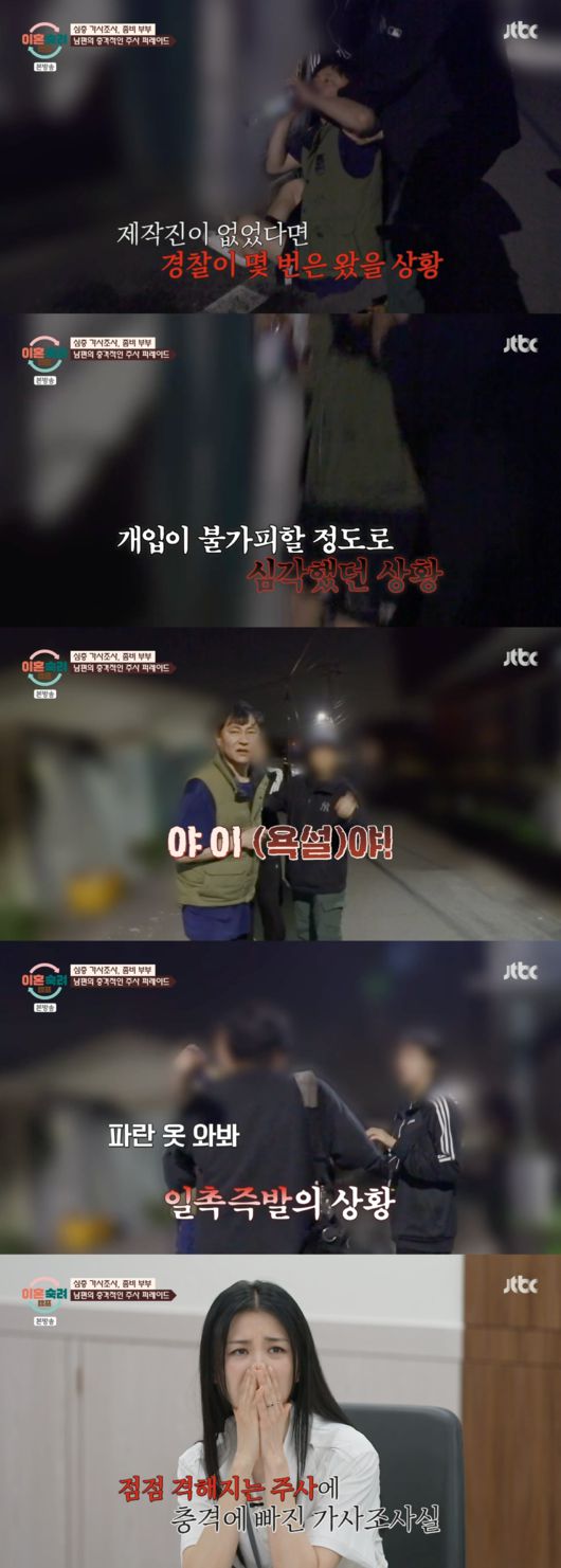 갑자기 제작진에게 시비를 걸며 욕설을 퍼부은 남편은 점점 주사가 과격해졌다. 남편은 “파란 옷 와봐. 야 이리 와봐”라며 심한 욕설을 하는 모습이 그려졌다. 점점 과격해지는 주사에 가사조사실을 충격에 빠졌다.