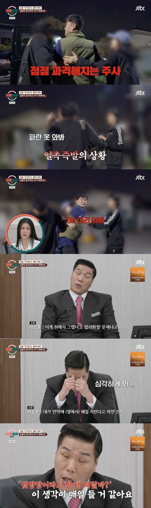 갑자기 제작진에게 시비를 걸며 욕설을 퍼부은 남편은 점점 주사가 과격해졌다. 남편은 “파란 옷 와봐. 야 이리 와봐”라며 심한 욕설을 하는 모습이 그려졌다. 점점 과격해지는 주사에 가사조사실을 충격에 빠졌다.