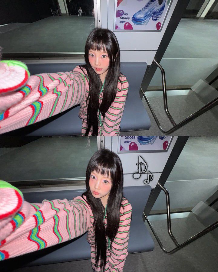 원희는 긴 생머리와 귀여운 핑크색 의상을 착용해 스타일링을 완성했다. 그녀는 스트라이프 의상의 소매를 길게 늘어뜨리며, 다양한 표정을 지어 팬들에게 다채로운 매력을 보여주었다.