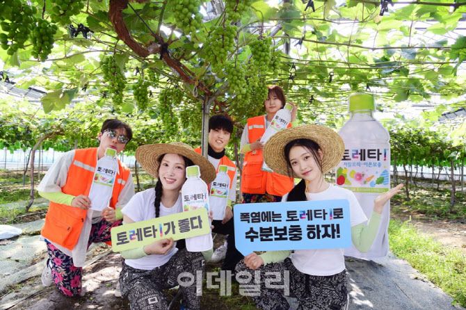 [이데일리 김태형 기자] 9일 경기도 안성시 서운면에서 상명대학교 학생들이 포도 포장 작업중 토레타!로 수분을 보충하고 있다.