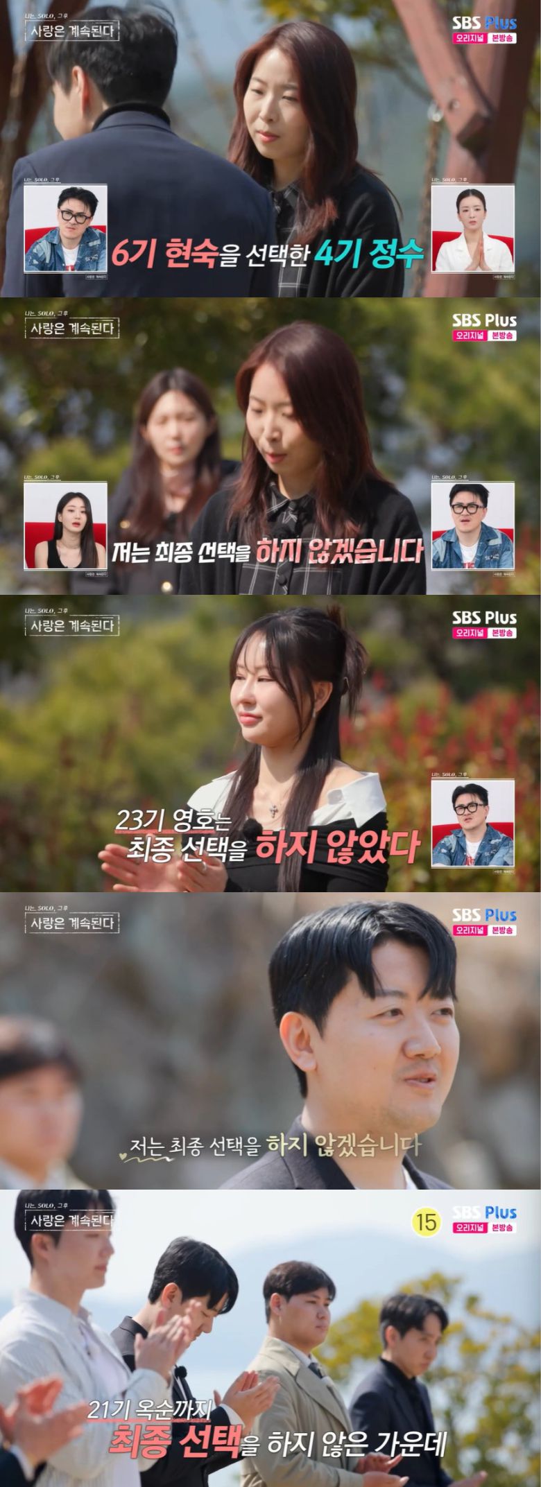 다음으로 등장한 24기 영수도 "좋은 분을 만나서 해산물도 먹고, 소고기도 맛있게 먹고 참 좋은 대화를 많이 나눴다. 하지만 아쉽게도 반려자는 찾지 못한 것 같다"면서 선택하지 않았고, 21기 옥순과 24기 광수도 선택을 포기하는 모습을 보였다.
