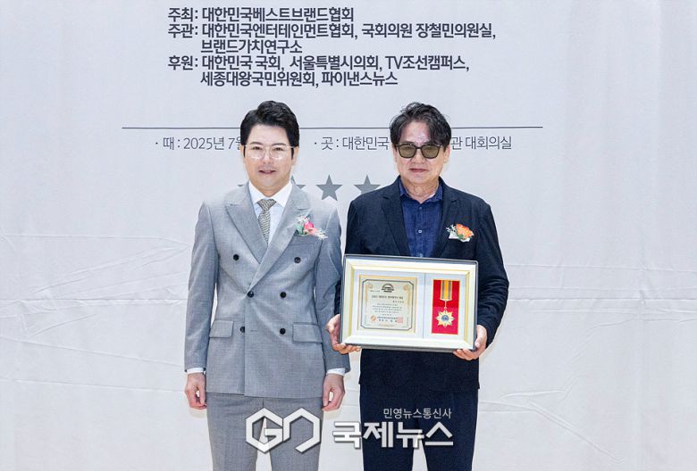 (서울=국제뉴스) 이대웅 기자 = '2025 대한민국 엔터테이너 시상식'이 5일 오후 서울 영등포구 국회의사당 국회의원회관 대회의실에서 열렸다. 이날 문화예술 부문에서 대한민국 엔터테이너 대상을 수상한 배우 이영하가 대한민국 엔터테인먼트협회 이일섭 회장과 함께 포즈를 취하고 있다.