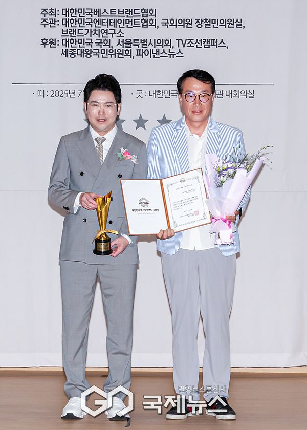 (서울=국제뉴스) 이대웅 기자 = '2025 대한민국 엔터테이너 시상식'이 5일 오후 서울 영등포구 국회의사당 국회의원회관 대회의실에서 열렸다. 이날 개인 브랜드 부문에서 대한민국 엔터테이너 대상을 수상한 세무법인 대명 강북지점 신현수 대표가 대한민국 엔터테인먼트협회 이일섭 회장과 함께 포즈를 취하고 있다.