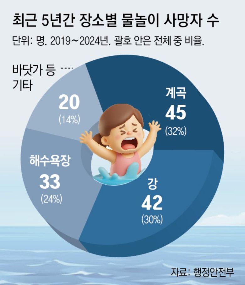 강이나 계곡은 바다보다 좁고 수심이 얕아 보이기 때문에 ‘덜 위험하다’고 생각하는 사람이 많다. 그러나 실제로는 물놀이 사고 사망자의 대부분이 강과 계곡에서 발생한다. 행정안전부 재난연감에 따르면 최근 5년(2019∼2024년)간 물놀이 사고로 총 140명이 사망했다. 이 중 계곡이 45명(32%)으로 가장 많았고, 하천(강) 42명(30%), 해수욕장 33명(24%), 바닷가(갯벌·해변) 20명(14%) 등의 순이었다. 강과 계곡에서 숨진 사람이 전체의 62%에 달하는 셈이다. 사망 원인을 보면 수영 미숙이 36%, 구명조끼 미착용 등 안전 부주의가 33%, 음주 수영이 17%로 나타났다. 대부분 사전에 주의를 기울였다면 피할 수 있었던 사고라는 뜻이다.
