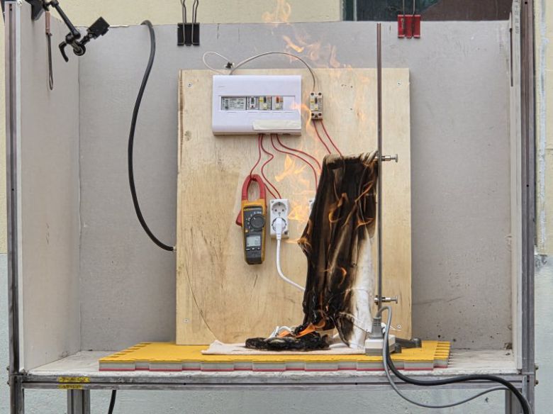 10A의 멀티탭에 15A 에어컨 1대, 10A 가전기기 1대의 플러그를 꽂아 정격전류를 2.5배 초과한 상황에서 플러그가 체결된 콘센트 배선은 3분 만에 70도를 넘더니 6분 만에 100도를 웃돌았다. 이어 7분30초가 채 안 돼 스파크가 튀었고, 콘센트 위 설치된 면 재질 커튼에 불이 붙었다.