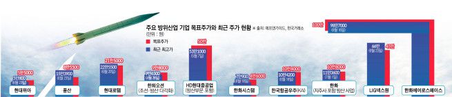 명실공히 K-방산 대장주인 한화에어로스페이스의 경우 지난달 16일 사상 최고치인 98만7000원을 기록해 목표주가 100만 원에 근접했다. 이후 차익 시현 매물로 인해 80만 원대에서 거래되고 있다.