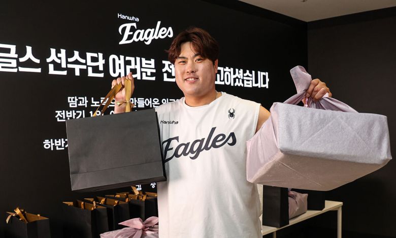 주장 채은성 선수는 “신구장 건립 지원부터 선수단 선물에 이르기까지 애정 어린 지원에 선수단 모두 감사한 마음을 갖고 경기에 나서고 있다”며 “후반기에도 한화그룹 모든 임직원과 이글스 팬들의 응원에 부응하기 위해 최선을 다해 좋은 성적을 달성하겠다”고 말했다.