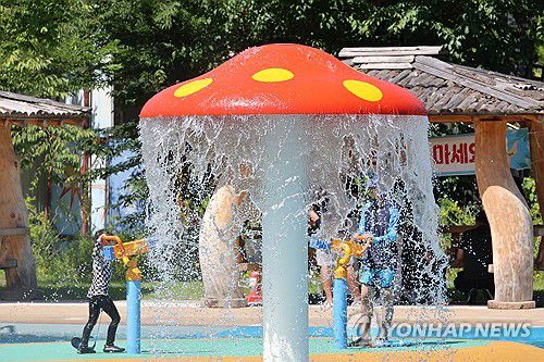 폭염 속 시원한 물줄기(제천=연합뉴스) 김형우 기자 = 폭염이 연일 이어지는 가운데 10일 오후 충북 제천시 의림지 수리공원 물놀이장에서 시민들이 물놀이를 즐기고 있다. 2025.7.10 vodcast@yna.co.kr