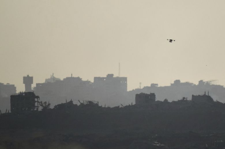지난 8일(현지시간) 이스라엘 남부에서 바라본 가자지구 북부 상공을 드론이 비행하고 있다. AP=연합뉴스