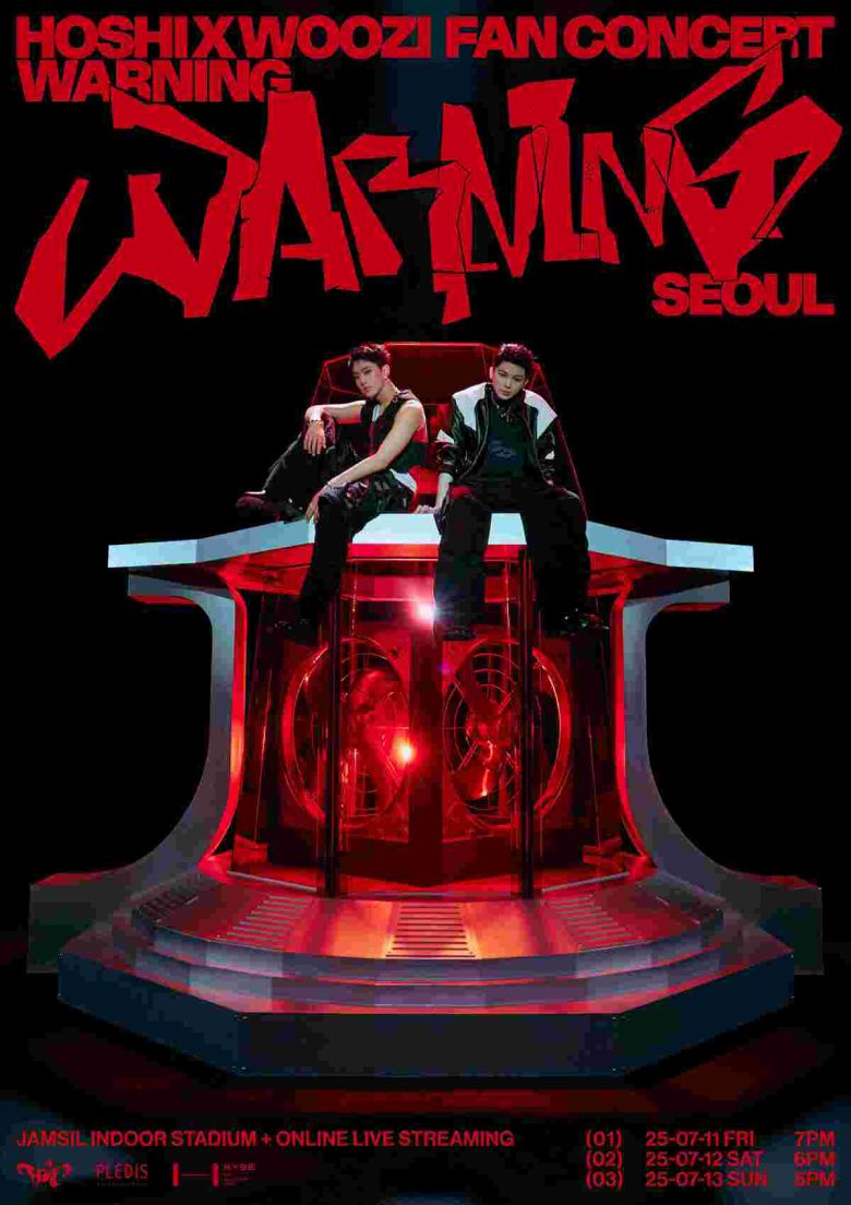 호시X우지는 11일~13일 3일간 서울 송파구 잠실실내체육관에서 팬콘서트 ‘HOSHI X WOOZI FAN CONCERT [WARNING](이하 WARNING)’을 개최한다. 티켓은 멤버십 선예매만으로 일찌감치 매진됐다. 3회 공연 모두 온라인 라이브 스트리밍이 병행돼 전세계 팬들이 함께 즐길 수 있다.
