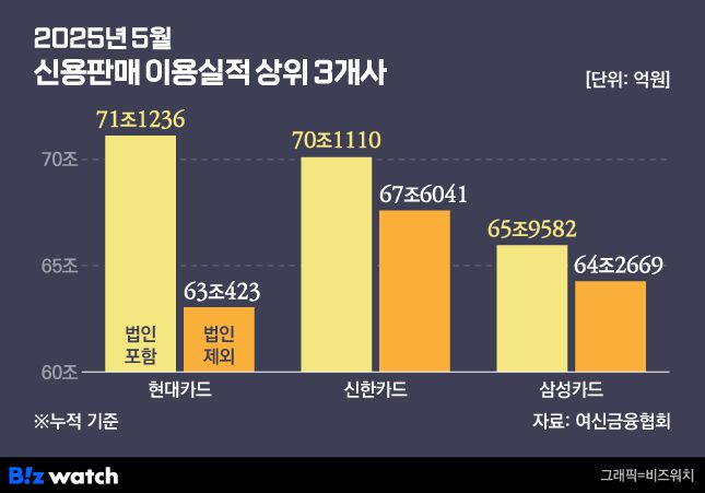 여신금융협회에 따르면 지난 5월 누적 현대카드 신용판매액은 71조1236억원으로 8개 전업 카드사 중 1위를 기록했다. 신용판매액은 현금서비스·카드론·체크카드 이용액을 제외하고 국내·외에서 신용카드로 승인된 모든 금액을 합산한 수치다.