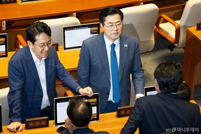 (서울=뉴스1) 유승관 기자 = 더불어민주당 당대표 후보로 등록한 박찬대 의원이 10일 서울 여의도 국회에서 열린 제427회 국회(임시회) 제1차 본회의에서 의원들과 대화하고 있다. 2025.7.10/뉴스1 Copyright (C) 뉴스1. All rights reserved. 무단 전재 및 재배포, AI학습 이용 금지. /사진=(서울=뉴스1) 유승관 기자 |