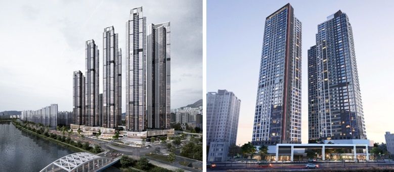 '르엘리버파크센텀(왼쪽)'과 '가야역롯데캐슬스카이엘' 투시도. 롯데건설 제공