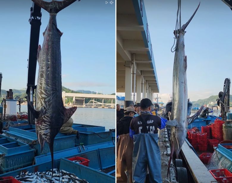 크레인으로 들어올려야 할 만큼 거대한 모습의 이 황새치는 길이 3m, 무게 226㎏으로 파악됐다.