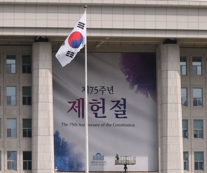 제75주년 제헌절을 앞둔 지난 2023년 7월 2일 오전. 서울 여의도 국회 본관에 제헌절 경축 현수막이 설치되고 있다.(사진=연합뉴스) |