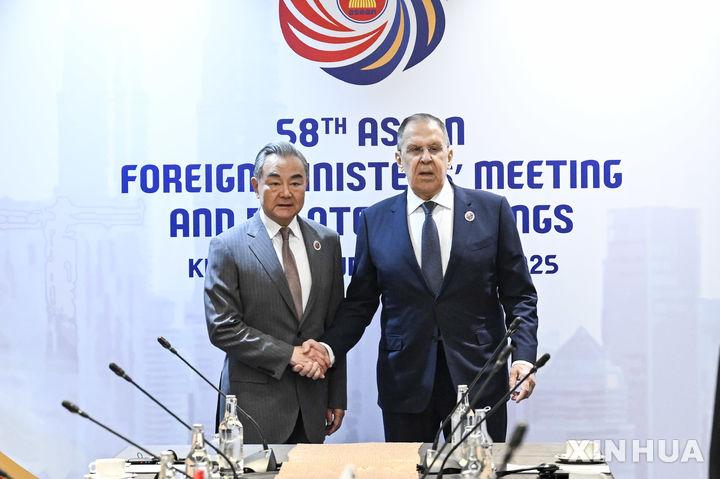 [쿠알라룸푸르=신화/뉴시스] 10일 말레이시아 쿠알라룸푸르에서 왕이 중국 공산당 중앙정치국 위원 겸 외교부장(왼쪽)과 세르게이 라브로프 러시아 외무장관이 회담에 앞서 악수하고 있다. 2025.07.11 |