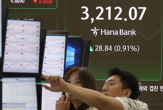 국내 증시 시가총액이 사상 처음으로 3000조원을 넘어선 가운데 코스피 지수도 3년10개월만에 3200선을 돌파 사상최고가를 기록한 11일 서울 중구 하나은행 딜링룸 모니터에 코스피 지수가 표시돼 있다. 이날 코스피는 전장보다 3.12포인트(0.10%) 오른 3,186.35로 출발했다. 2025.7.11 조용준 기자 |