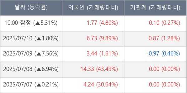 [서울=뉴스핌] 로보뉴스 = 11일 10시 15분 현재 LS증권(078020)은 전일 대비 5.31% (현재가 5,950원) 상승했고, 외국인이 최근 5일 연속 순매수(누적 30.50만 주, 잠정) 행진을 하고 있다.