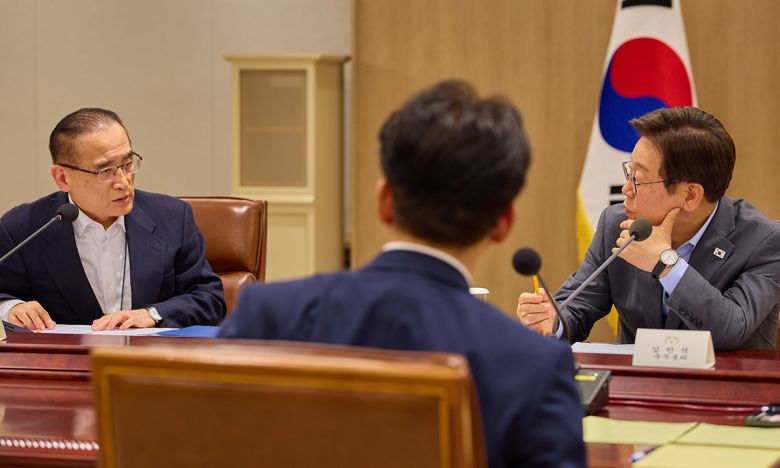 이재명 대통령이 지난 10일 서울 용산 대통령실 청사에서 열린 국가안전보장회의(NSC) 전체회의에서 위성락 국가안보실장과 대화를 하고 있다. 대통령실 제공 |