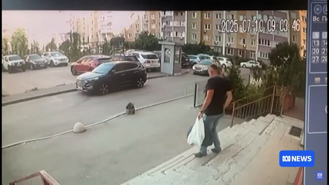 우크라이나 보안국(SBU) 소속 고위 장교가 10일(현지시간) 오전 9시 괴한의 총격을 받기 전에 건물에서 나와 차량으로 이동하고 있는 모습. (사진=호주 ABC뉴스 방송 캡처)