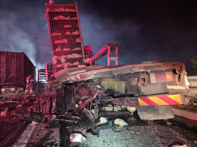이 사고로 양계 트럭과 트레일러 운전자 등 2명이 사망했다. 1.2t 화물차 운전자도 다쳐 병원으로 이송됐다.