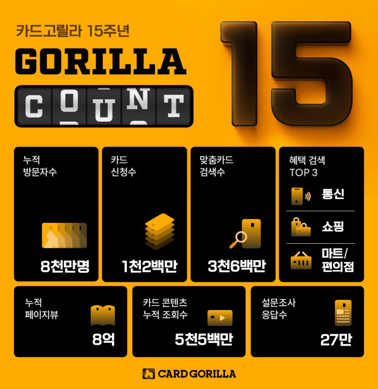 국내 최대 신용카드 플랫폼 카드고릴라가 서비스 오픈 15주년을 기념해 인포그래픽 '고릴라 카운트 (GORILLA COUNT)'를 11일 발표했다.