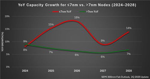 7나노(㎚·1㎚=10억분의 1m) 이하 첨단 공정 생산능력은 작년 월간 기준 85만장에서 2028년 140만장으로 약 69% 증가해 역대 최고치를 기록할 것으로 전망된다.