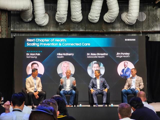 10일 미국 뉴욕 브루클린 듀갈 그린하우스에서 열린 '갤럭시 테크 포럼'에 박헌수(왼쪽부터) 삼성전자 MX사업부 디지털 헬스팀장, 마이클 맥셰리 젤스 최고경영자, 라수 스레스타 어드보케이트 헬스 부사장 라수 스레스타, 짐 퍼슬리 힌지 헬스 대표가 토론하고 있다. 뉴욕=김진욱 기자