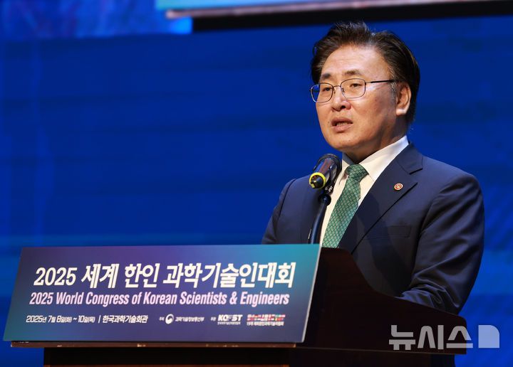 [서울=뉴시스] 이영환 기자 = 유상임 과학기술정보통신부 장관이 9일 오전 서울 강남구 한국과학기술회관에서 열린 2025 세계 한인 과학기술인대회 개회식에 참석해 이재명 대통령의 축사를 대독하고 있다. 2025.07.09. 20hwan@newsis.com