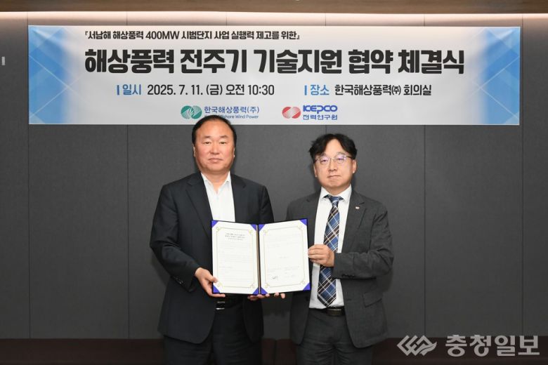한전과 한국해상풍력(주)은 11일 서울사무소에서 '서남해 400MW 해상풍력 시범단지' 사업의 성공적 이행을 위한 전주기 기술지원 협약을 체결했다. 협약은 해상풍력 개발의 기획부터 설계, 시공, 운영까지 전 과정을 포괄하는 협력 체계 구축의 출발점이다.