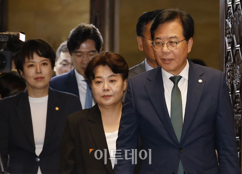 송언석(오른쪽) 국민의힘 비상대책위원장 겸 원내대표와 윤희숙(가운데) 혁신위원장이 9일 서울 여의도 국회에서 열린 긴급의원총회에 참석하고 있다. 고이란 기자 photoeran@ |