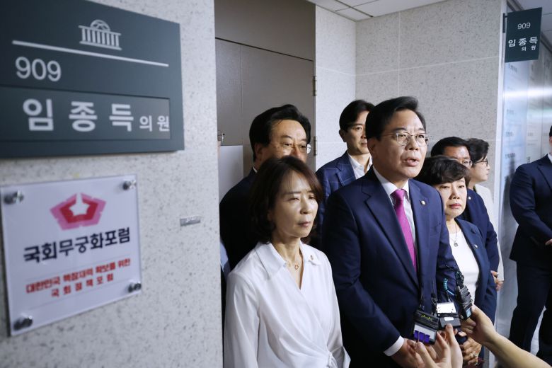 국민의힘 의원들은 11일 해병대원 순직사건 관련 의혹을 수사하는 이명현 특검수사팀이 자당 임종득 의원 의원실을 압수수색하자 임 의원실로 모여들었다. 송언석 국민의힘 비상대책위원장 겸 원내대표는 “명백한 야당 탄압이자 정치보복”이라고 목소리를 높였다.