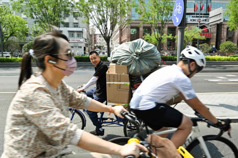 지난 6월 11일 베이징의 한 거리에서 택배 물품을 운반하던 한 남성이 자전거를 타고 지나가는 행인들을 쳐다보고 있다. AFP 연합뉴스