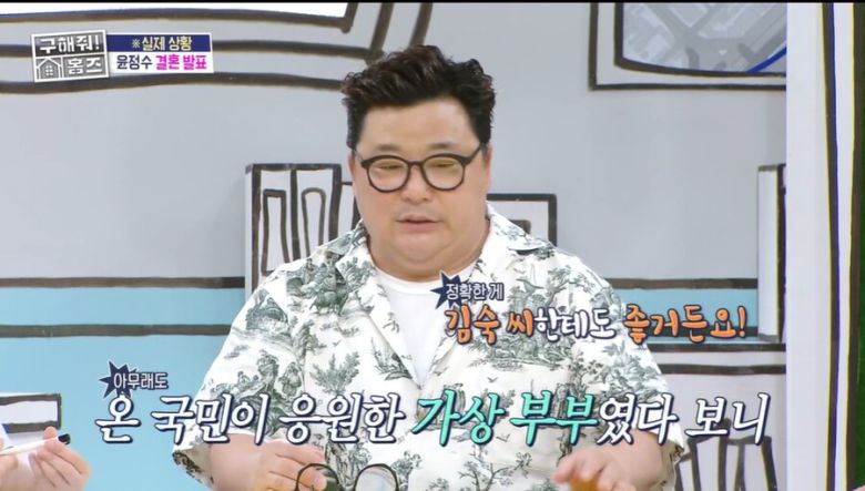 윤정수는 "온 국민의 염원이었던 김숙씨가 있는 곳에서 이 이야기를 하는 게 가장 나을 거라고 생각했다"면서 "(구본승 때문에) 복수는 아니지만 이제는 나도 아니구나 생각을 했다"고 너스레를 떨었다.