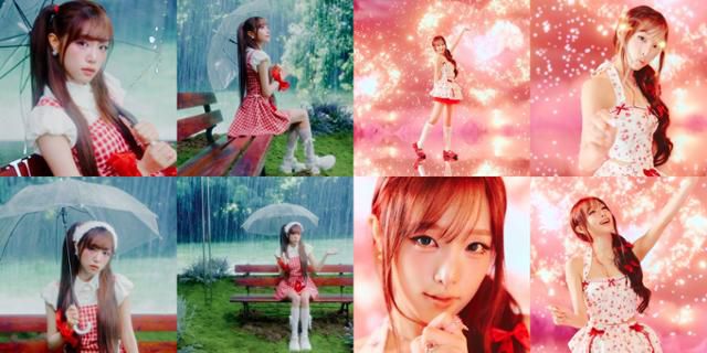 네 번째 콘셉트 포토 속 최예나는 레드와 화이트 컬러가 어우러진 체크무늬 원피스에 블라우스를 매치해 동화 속 캐릭터를 연상케 하는 비주얼을 선보였다. 여기에 화이트 레이스 머리띠를 착용하고, 비 내리는 버스 정류장에 앉아 차분하고 몽환적인 분위기를 완성했다.