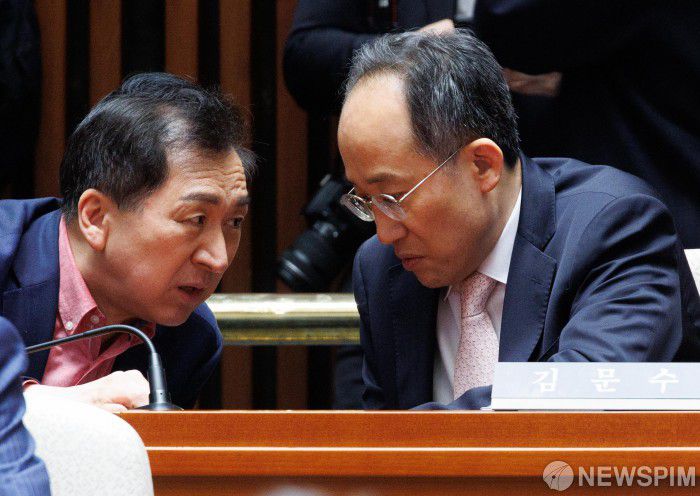 [서울=뉴스핌] 윤창빈 기자 = 김기현-추경호 국민의힘 의원이 14일 오후 서울 여의도 국회에서 열린 의원총회에서 대화를 나누고 있다. 2025.04.14 pangbin@newspim.com |