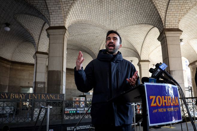 조란 맘다니 뉴욕 시장 후보가 지난 4월 1일(현지시간) 미국 뉴욕의 한 지하철 역 앞에서 선거운동 중 기자회견을 하고 있다./로이터 연합 |