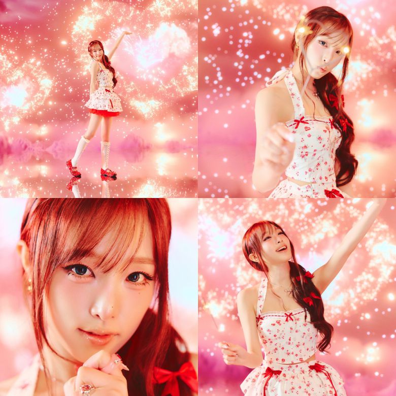 다섯 번째 콘셉트 포토에서는 최예나의 발랄한 에너지가 돋보였다. 레이스 미니 스커트와 슬리브리스 톱, 화이트 니삭스와 레드 컬러 구두를 매치해 개성 있는 스타일을 완성했으며, 애니메이션 속 주인공을 연상케 하는 비주얼로 시선을 끌었다. 또 불꽃놀이가 화려하게 펼쳐진 배경과 함께 하트 모양 불꽃이 더해지며 마치 꿈속 축제를 연상시키는 무드를 자아냈다.