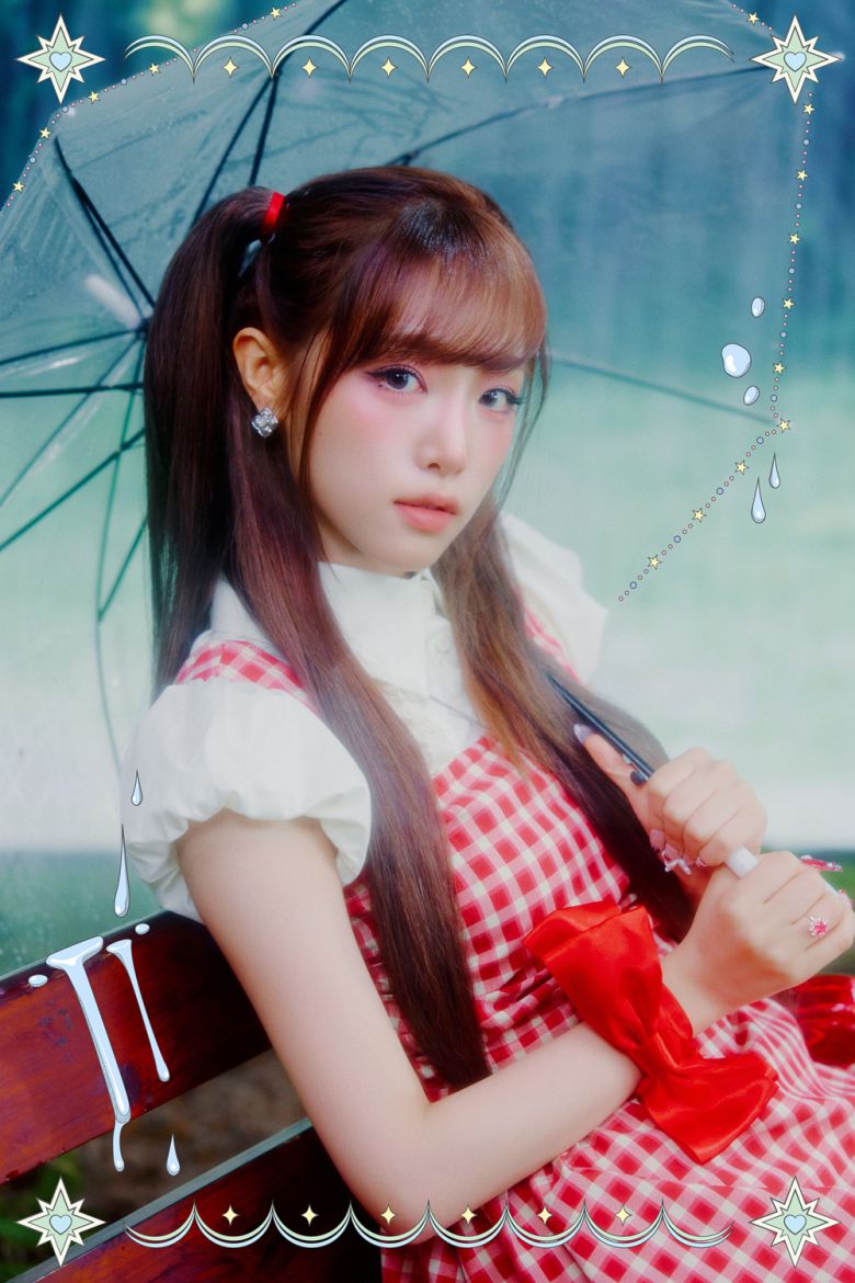 네 번째 콘셉트 포토 속 최예나는 레드와 화이트 컬러가 어우러진 체크무늬 원피스에 블라우스를 매치해 동화 속 캐릭터를 연상케 하는 비주얼을 선보였다. 여기에 화이트 레이스 머리띠를 착용하고, 비 내리는 버스 정류장에 앉아 차분하고 몽환적인 분위기를 완성했다.