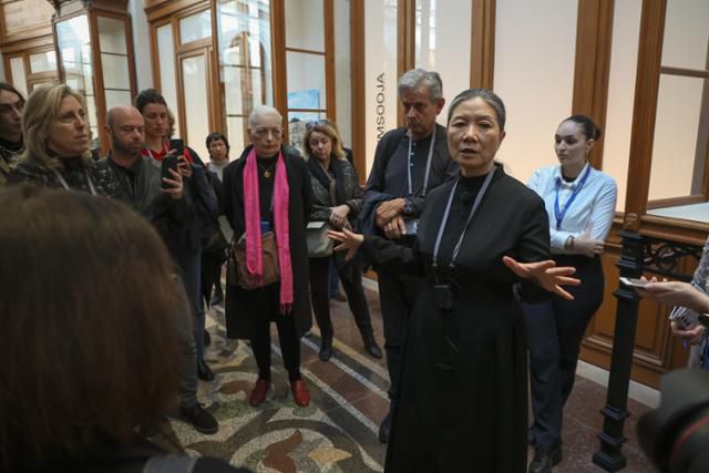 김수자 작가가 지난해 3월 19일 프랑스 파리 피노컬렉션 미술관에서 개인전을 열고 작품을 설명하고 있다. 파리=뉴스1