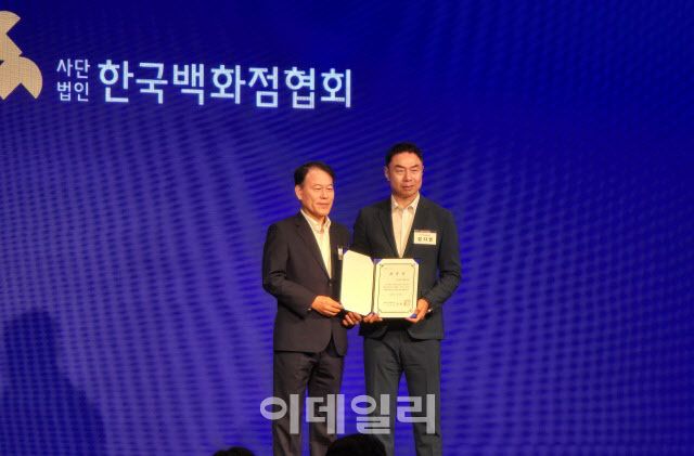 정지영 현대백화점 대표가 11일 서울 영등포구 중소기업중앙회에서 열린 ‘제5회 유통상생대회’에서  사단법인 한국백화점협회장으로서 국회 정무위원장 표창을 수상했다. (사진=김지우 기자)