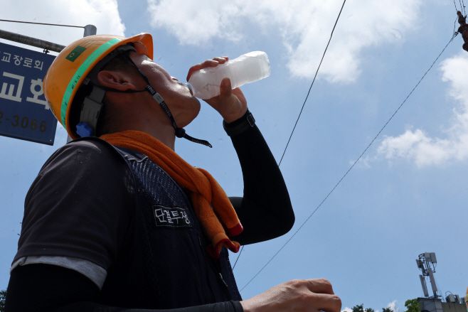 지난 7월 2일 광주 서구 금호동 한 공사장 앞에서 한 건설노동자가 더위를 달래기 위해 얼음물을 마시고 있다. /연합뉴스