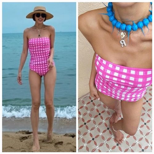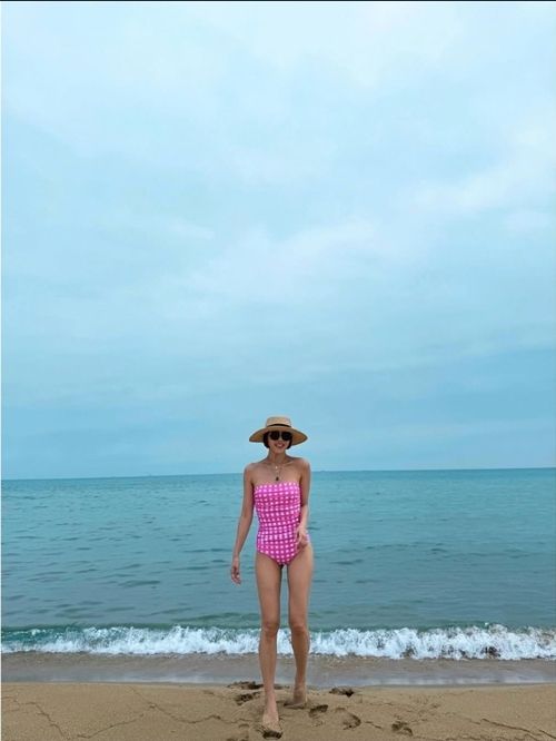 공개된 사진 속 최은경은 핑크 체크 스윔수트에 챙 넓은 모자, 큼직한 선글라스로 시선을 끌었다. 가까이 찍힌 또 다른 컷에서는 푸른 구슬 초커와 알파벳 ‘R’ 펜던트가 그녀만의 감각을 증명했다. 발목에 채운 실버 발찌는 은은하게 반짝였다.