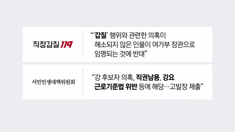 [조은희 / 국민의힘 의원 : 여성가족부는 약자를 보호하는 자리입니다. 그런데 강 후보자는 갑질을 막겠다고 태움 방지법을 발의해 놓고서는 실제론 갑질의 여왕이 되었다는 사실에 국민은 분노하고 있습니다. 위선의 끝판왕이다.]