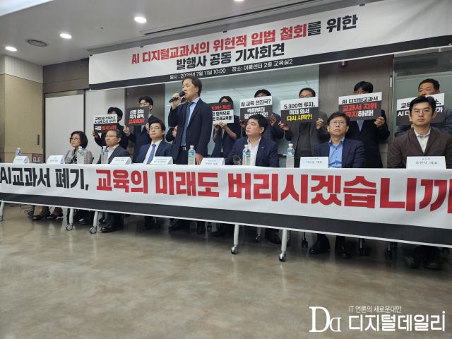 AIDT 발행(예정)사와 교과서발전위원회, 에듀테크 업체는 11일 서울 여의도에서 'AI 디지털교과서의 위헌적 입법 철회를 위한 발행사 공동 기자회견'을 열었습니다. 박정과 천재교과서 대표는 "정부를 믿고 투자했는데 개발비 회수가 안 되면 결국 구조조정이 불가피한 상황"이라며 "정부 정책에 대한 신뢰가 추락하면 앞으로 민간 기업이 국가 정책과 파트너십을 가져가기 어렵다"고 역설했죠.