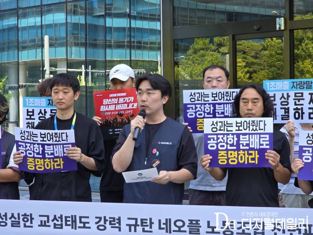 11일 민주노총 화학섬유식품노조 네오플 분회는 성남시 분당구에 위치한 넥슨 판교 사옥 앞에서 기자회견을 열었다.